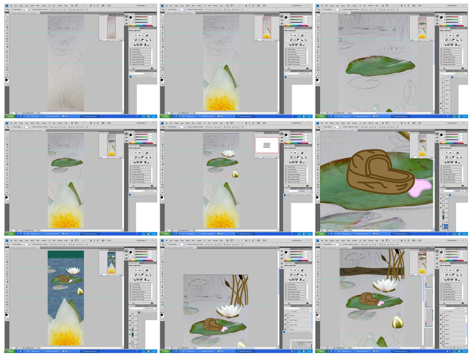 After applying my design drawing as the bottom layer, I was able to start piecing together my image using a combination of photographs and rough digital painting. The first area I wanted to work on was the flower in the foreground. I want to create the impression that the audience has a viewpoint from inside the flower; however, the images I have of water lilies were taken from above, as I couldn't get into the water to get closer to the flowers. Therefore, it might be difficult to find an image with the right angle to create this impression. I will experiment with this a little later on. I then selected some lily pads and flowers and drew in reeds, the walnut shell bed and a water effect background.